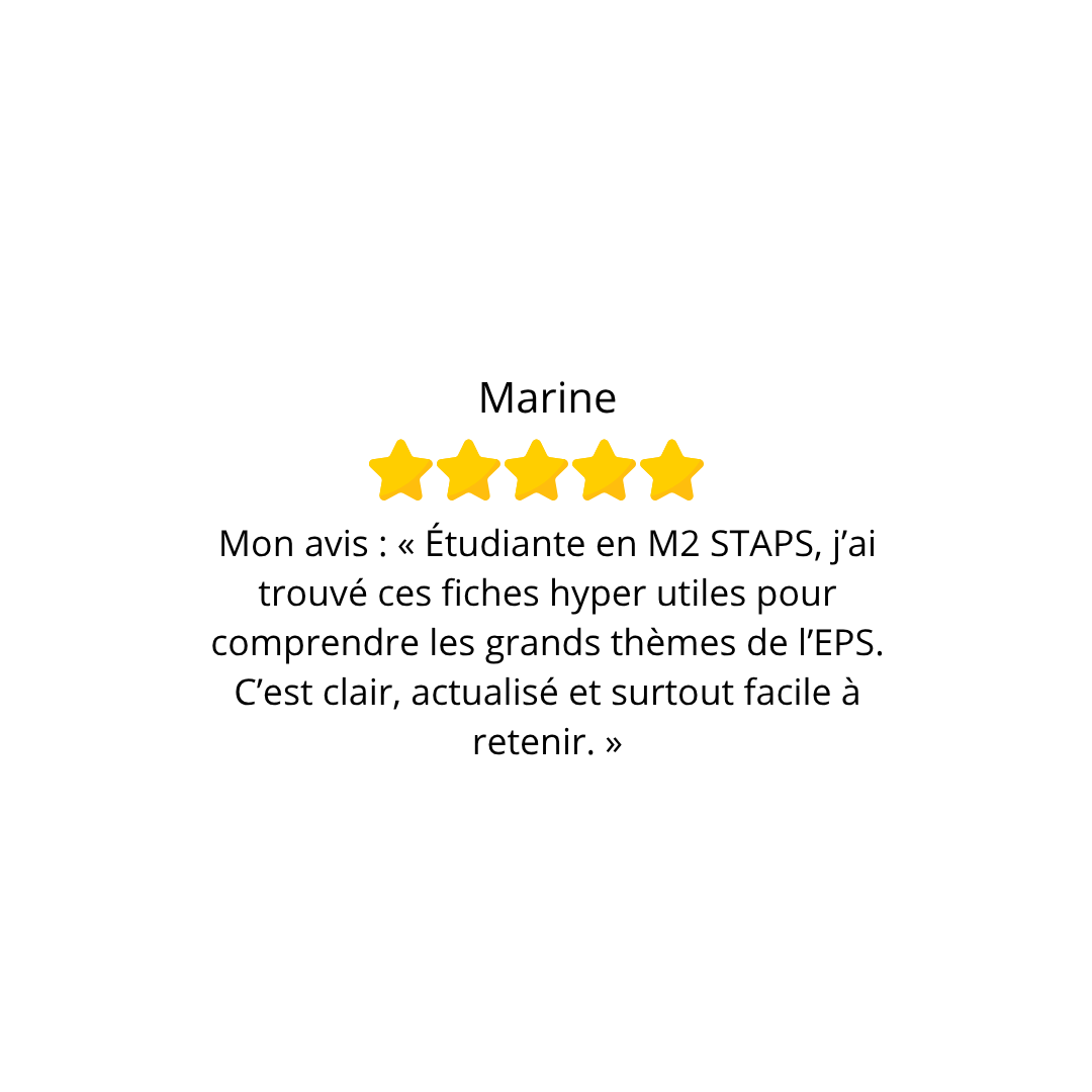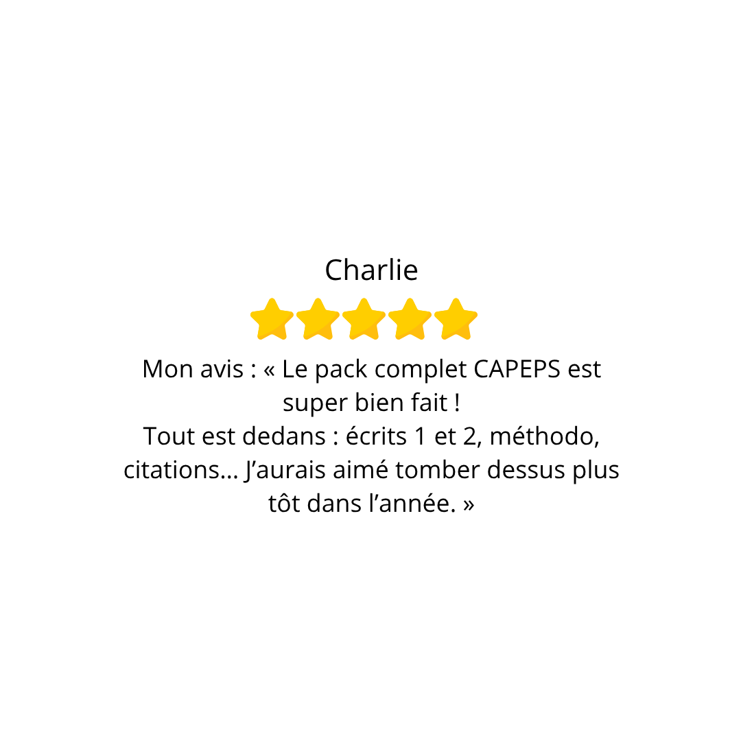 Préparez le CAPEPS avec des fiches de révision claires, concises et à jour. Réussissez les écrits et oraux grâce à des packs complets conçus par un professeur d’EPS pour des futurs professeurs. Ils ont choisi mes fiches pour préparer le CAPEPS... et ils ont réussi !